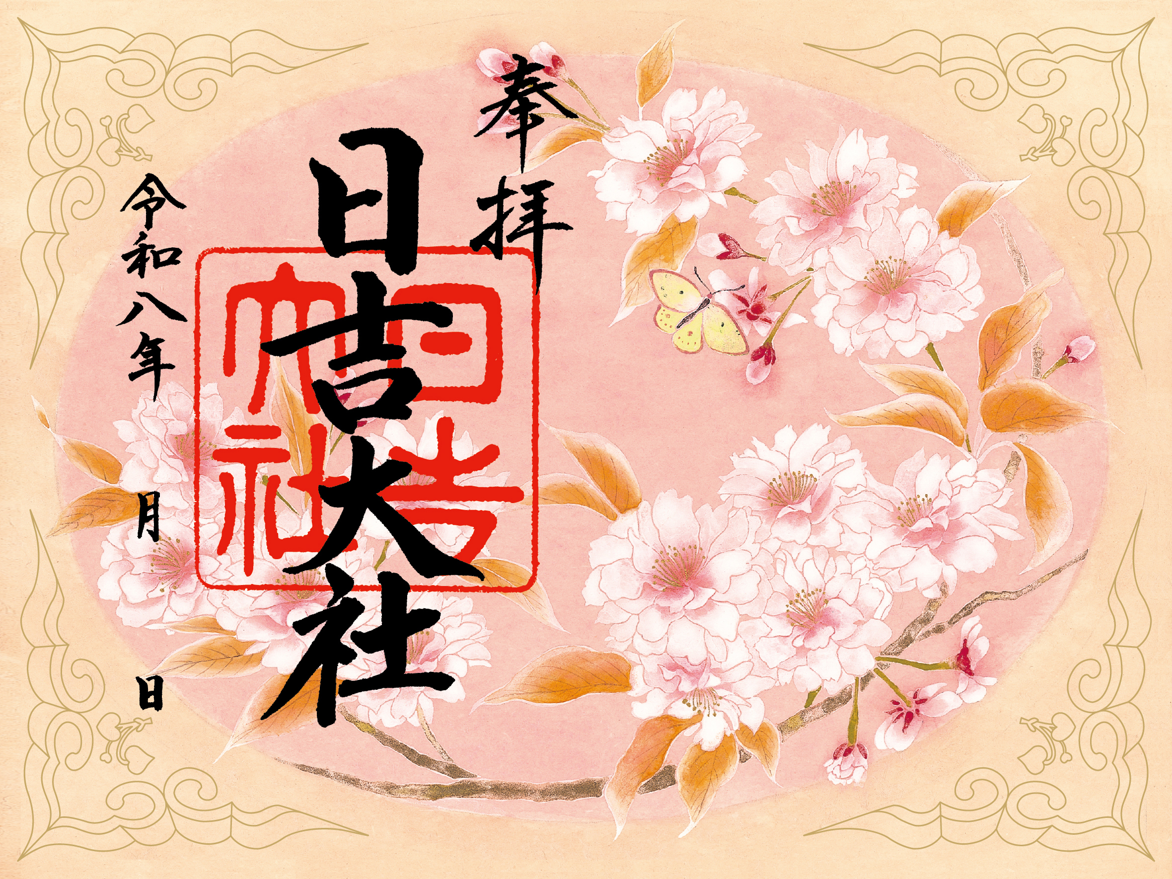 咲き誇る淡い桃色の桜と、その傍らで春を祝うように舞い遊ぶ蝶を描いた、優雅で温かみのあるデザインです。令和八年の参拝の証として、ぜひお受けください。