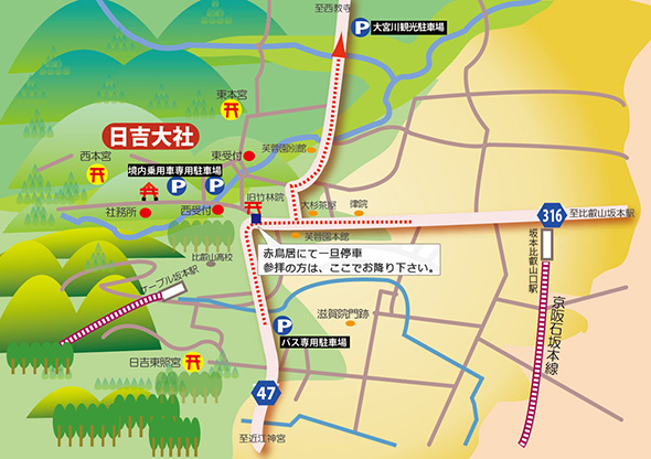 名神高速道路「京都東IC」で下車、湖西道路西大津バイパス(国道161号)経由、「滋賀里ランプ」で下車、丁字路で県道47号を左折し北へ道なりです。(「京都東IC」より約20分)