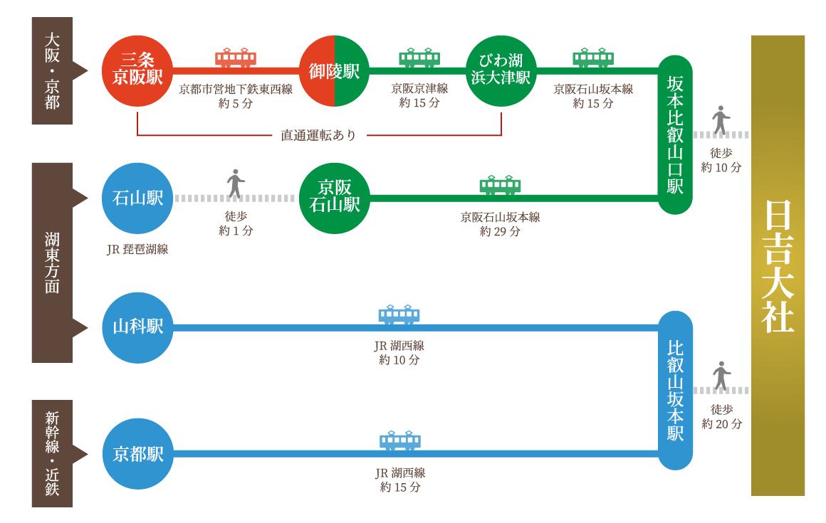 ②JR琵琶湖線で山科駅→湖西線乗り換えで比叡山坂本駅へお越しください