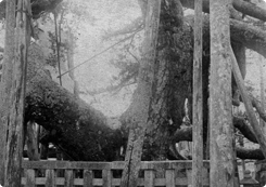 享保19年(1734)に発行された『近江輿地志略(おうみよちしりゃく)』には、「樹高はそれほど高くなく、枝葉が四方に繁り七間四方(12.6m×12.6m)の大きさで雨宿りが出来る。姿形がまことに均整がとれて美しい」と書かれています。植栽から約140年経っておりますが、とりわけ巨大ということではなかったようです。しかし、それから約100年後に描かれた浮世絵「唐崎夜雨図」では枝が琵琶湖まで達し、同時期の版画にも枝の東西54m・南北68.4mという注記があり途方もない大きさになっていたことがわかります。さらに明治初期(『近江輿地志略』から130年後)の由緒書には高さ27m(後に大風で折れて10m)幹廻り11m、枝東西72m・南北86mと記録しています。その頃の写真が長崎大学附属図書館に所蔵されています。